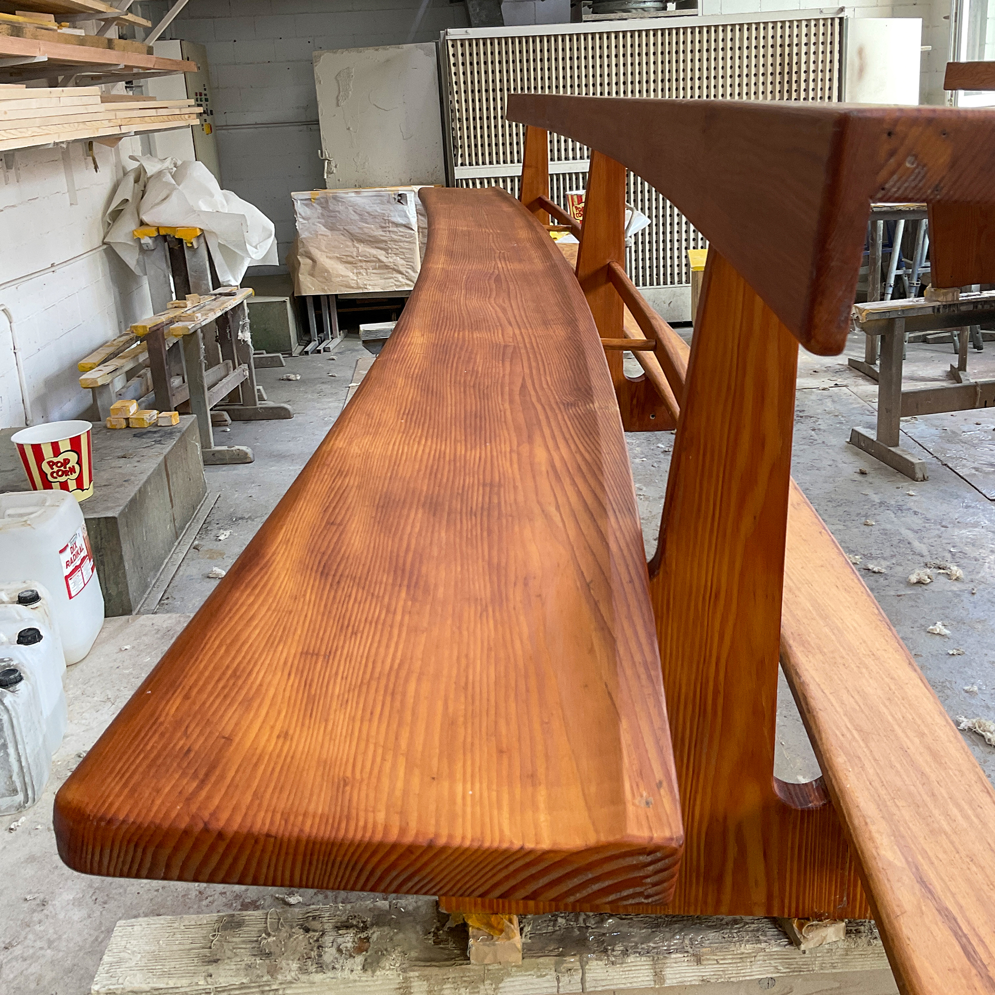 Für die Kirche Bruder Klaus in Oberwil durften wir die bestehenden Kirchenbänke umfassend restaurieren. Nach der sorgfältigen Demontage transportierten wir die Bänke in unsere Werkstatt. Dort entfernten wir den abgenutzten Lack behutsam und reinigten das Holz gründlich, um die Basis für die weitere Bearbeitung zu schaffen.